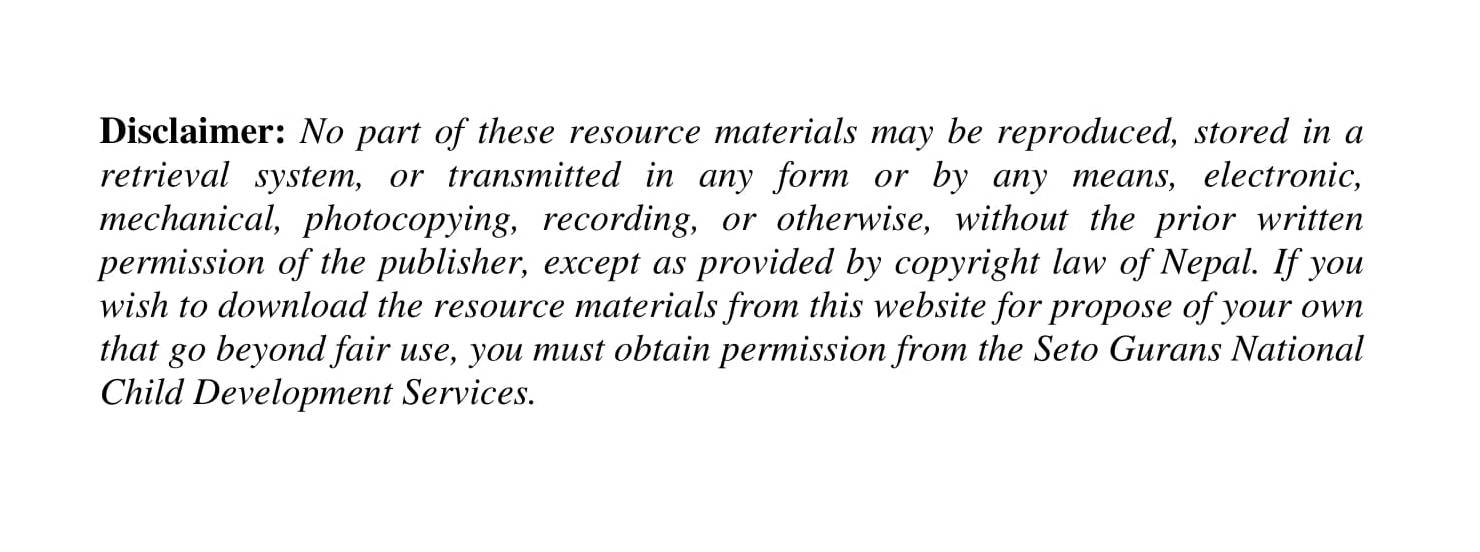 Disclaimer: No part of these resource materials may be reproduced, stored in a retrieval system, or transmitted in any form or by any means, electronic, mechanical, photocopying, recording, or otherwise, without the prior written permission of the publisher, except as provided by copyright law of Nepal. If you wish to download the resource materials from this website for propose of your own that go beyond fair use, you must obtain permission from the Seto Gurans National Child Development Services.